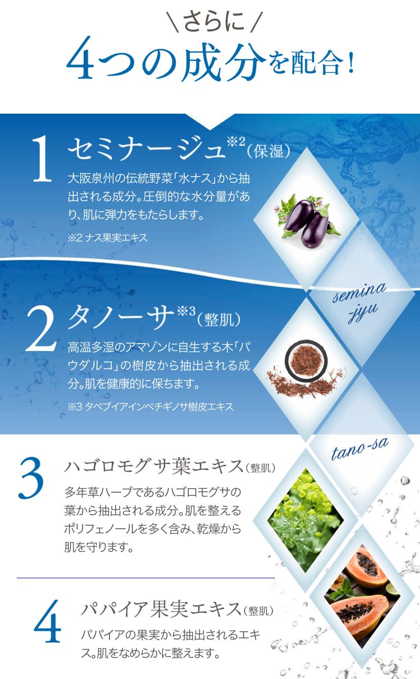 01:セミナージュ = 大阪先週の伝統野菜『水ナス』から抽出される特許成分。圧倒的な水分量があり、コラーゲンの生成を促進します。